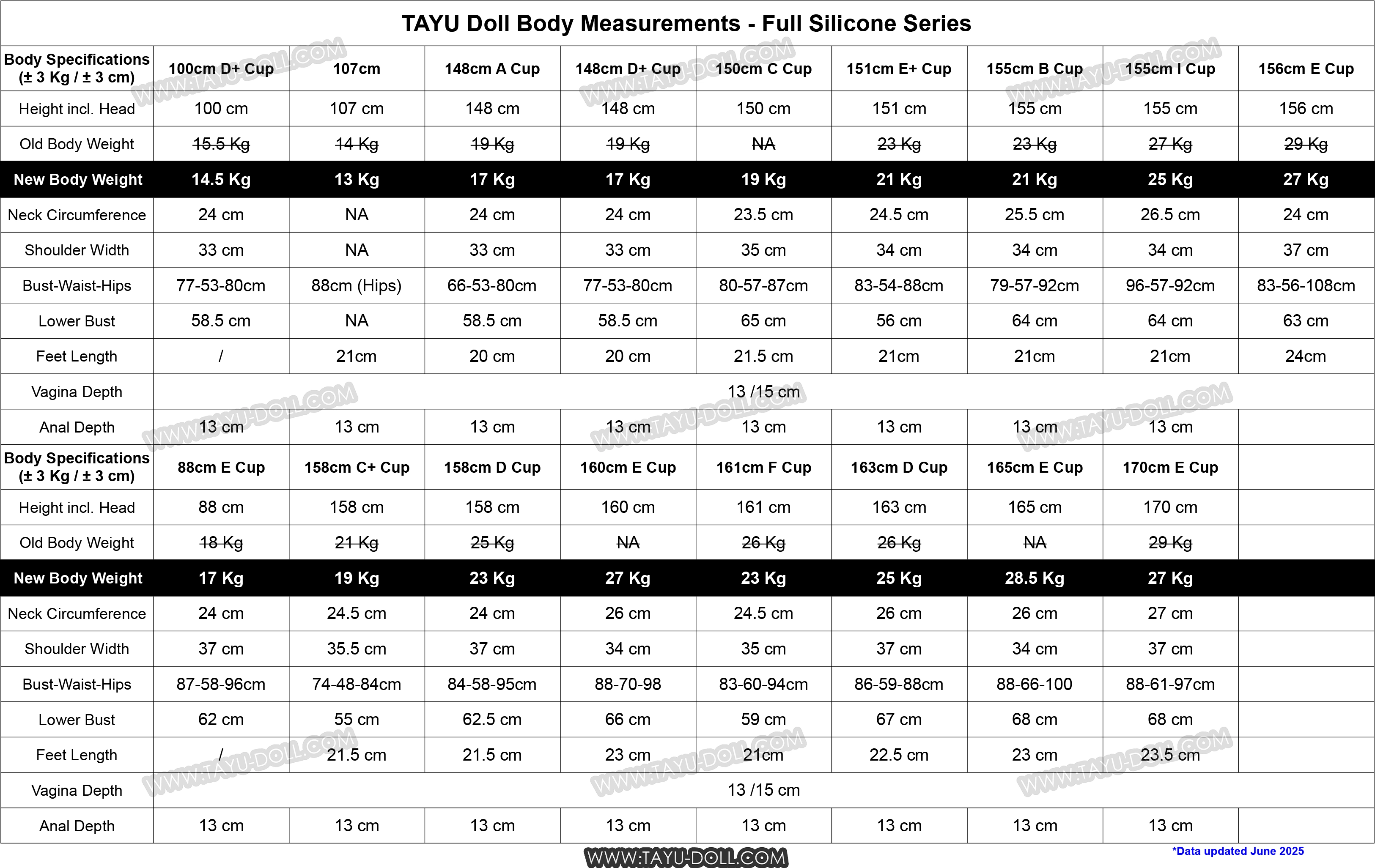 On weight reduction: I think 50-60LBs seems to be the upper limit for most functionally-minded doll owners. The question then, is just how much Jello manufacturers can sneak on the frame in just the right places. But yeah, I’d never expect them to be able to get a busty full-sized girl down to < 60LBs. From 70 to 60? My hope is that that's doable, somehow (the TAYU weight chart you linked shows they're clearly finding ways and hope to reach that holy grail first).